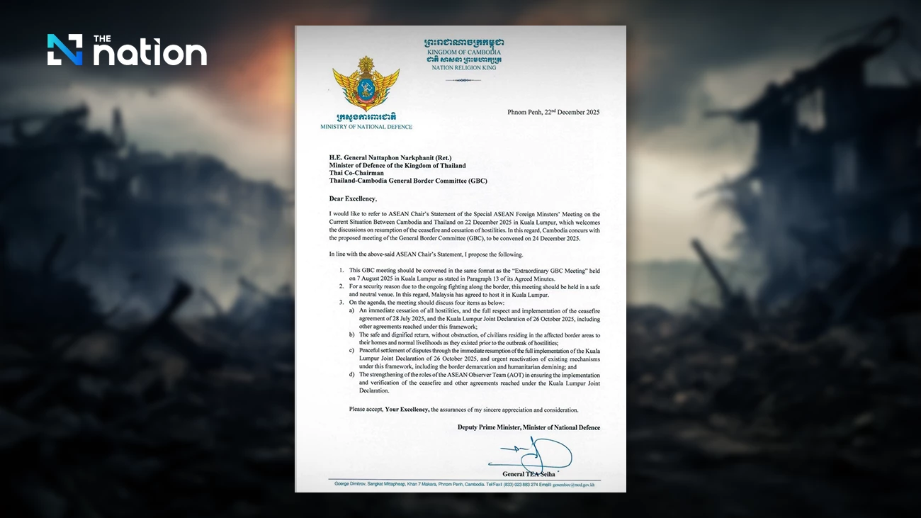 柬埔寨国防部于2025年12月22日通过迪班·赛哈将军(Tea Seiha)署名,向泰国国防部长发出正式信函,表达通过东盟边境委员会(GBC)机制开展停火谈判的意愿。此举被视作符合泰国提出条件的重要进展。