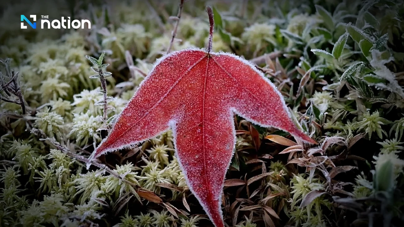 保护区管理处指出,霍克诺克克拉巴森林保护站(Khok Nok Kraba Forest Protection Unit)区域冷空气与适宜湿度叠加,导致草尖广泛结霜。最引人注目的是,霜冻覆盖了”kuam daeng”(红叶树)的深红色叶片,这种本地树种因秋季呈现艳丽红叶被称作”泰国枫树”。