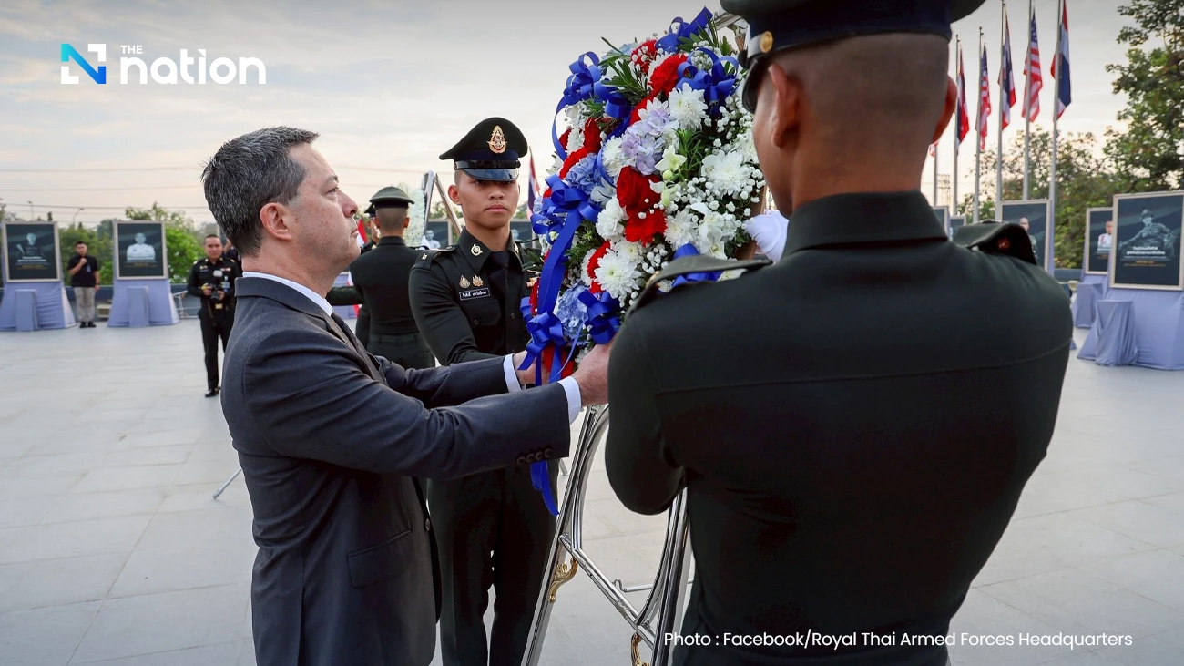2026年1月26日上午8时30分,泰国国家国防研究院国家纪念堂举行悼念仪式。泰国武装部队总司令乌奇特·博昂农上将与美国驻泰国大使肖恩·奥尼尔共同向在战场中牺牲的泰国士兵献花圈,缅怀为国捐躯的英灵。