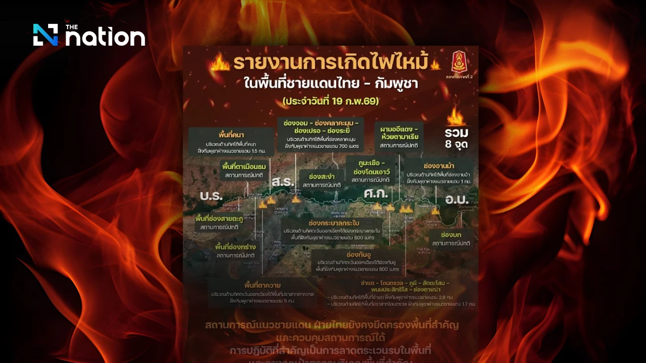 2026年2月19日,泰国第二军区通报了泰国与柬埔寨边境地区持续的山火情况,目前有八个重点区域处于监控状态。尽管已观测到柬埔寨方向靠近边境的烟雾和火情,但整体局势仍处于可控范围。